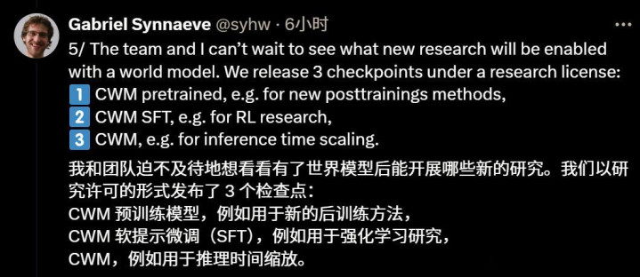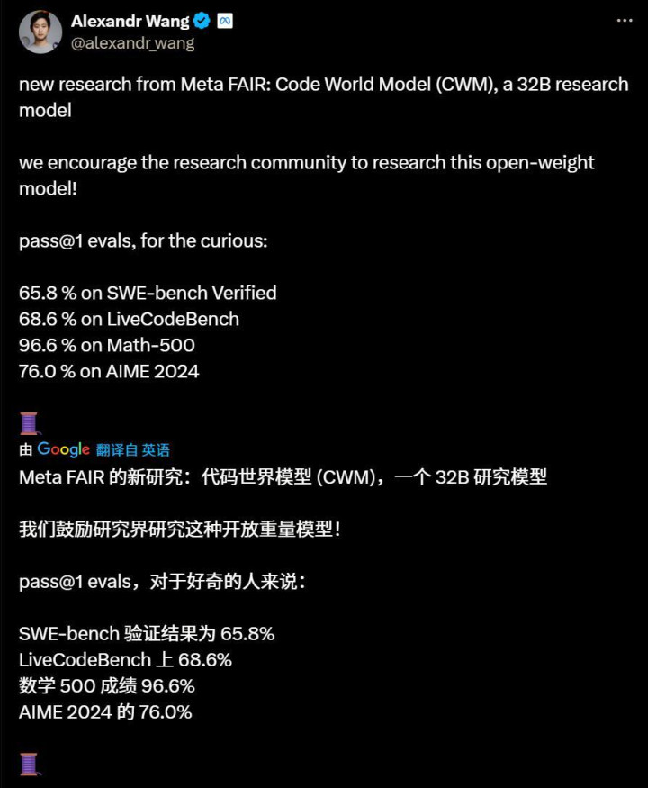 专门训练一个代码世界模型,补足这一点,生成代码的效果会不会好很多,是Meta要通过本次发布的CWM验证的猜想。