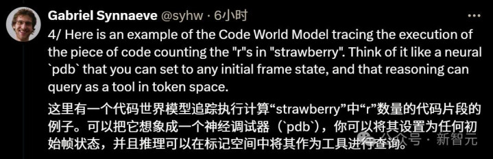 对于「数数strawberry中有多少个r」这个难倒无数大模型的问题,CWM也用类似pdb(Python Debug用的调试器)的形式演示了其工作流程: